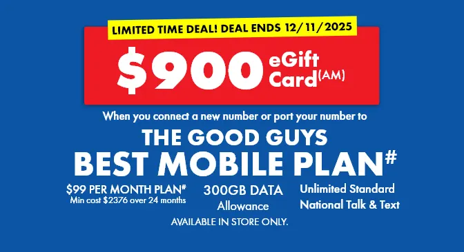 (AM)Offer available to port-in mobile services (excluding JB Hi-Fi Upfront/Prepaid, The Good Guys Mobile & Broadband, Telstra and Boost) and new Telstra mobile service customers only. The Good Guys eGift Card (referred to as “The Good Guys Voucher” in the Telstra Terms and Conditions) will be issued to you by email within 5 business days of connection approval by Telstra. The $900 The Good Guys eGift Card replaces the value of the Voucher stated in the Critical Information Summary. If you cancel or move to a lower cost/different plan then you must pay a Voucher Repayment Fee to Telstra pro-rated against the remaining months of your plan’s minimum term. This offer is not available in conjunction with any other The Good Guys mobile or broadband offer and is limited to 3 connections per customer. The Good Guys eGift Card subject to Terms & Conditions.