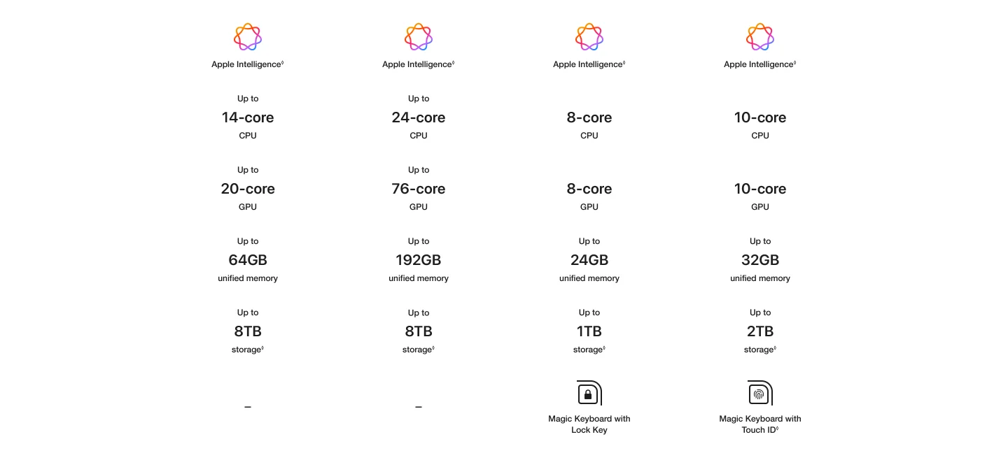 Apple Intelligence: Apple Intelligence is available in beta on all Mac models with M1 and later, with Siri and device language set to Chinese (Simplified), English (Australia, Canada, India, Ireland, New Zealand, Singapore, South Africa, UK or US), French, German, Italian, Japanese, Korean, Portuguese (Brazil) or Spanish, as a macOS Sequoia update, with more languages coming over the course of the year, including Vietnamese. Some features may not be available in all regions or languages.