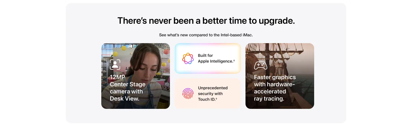 Up to 6x Faster than the Most Popular Intel-Based iMac (21.5-inch iMac, 2019): Testing conducted by Apple in September and October 2024 using preproduction 24-inch iMac systems with Apple M4, 10-core CPU, 10-core GPU and 16GB of RAM, as well as production 3.0GHz 6-core Intel Core i5–based 21.5-inch iMac systems with Radeon Pro 560X with 4GB of GDDR5 memory and 8GB of RAM, all configured with 256GB SSD. Tested using Super Resolution with Photomator 3.3.23 and a 4.4MB image. Performance tests are conducted using specific computer systems and reflect the approximate performance of iMac.