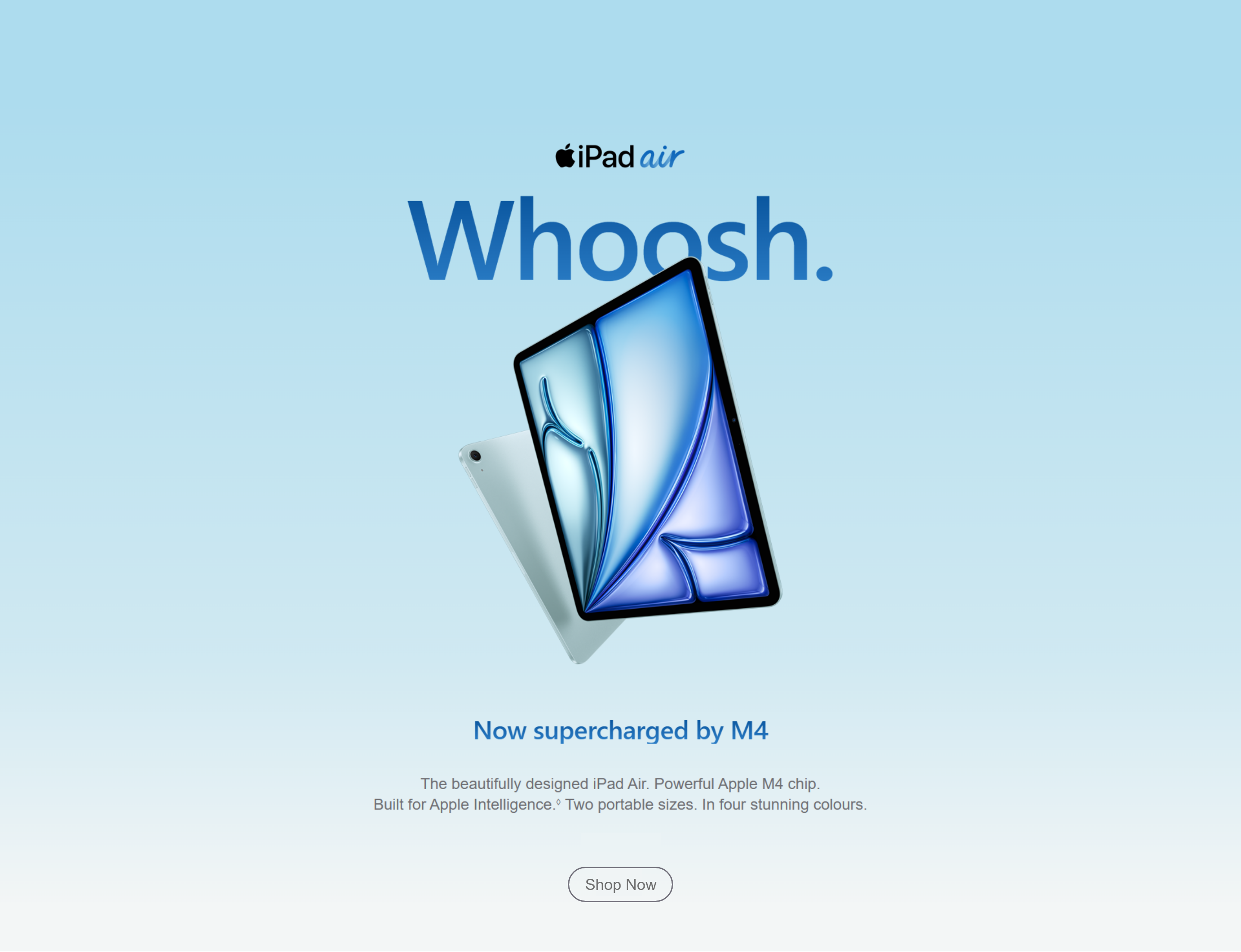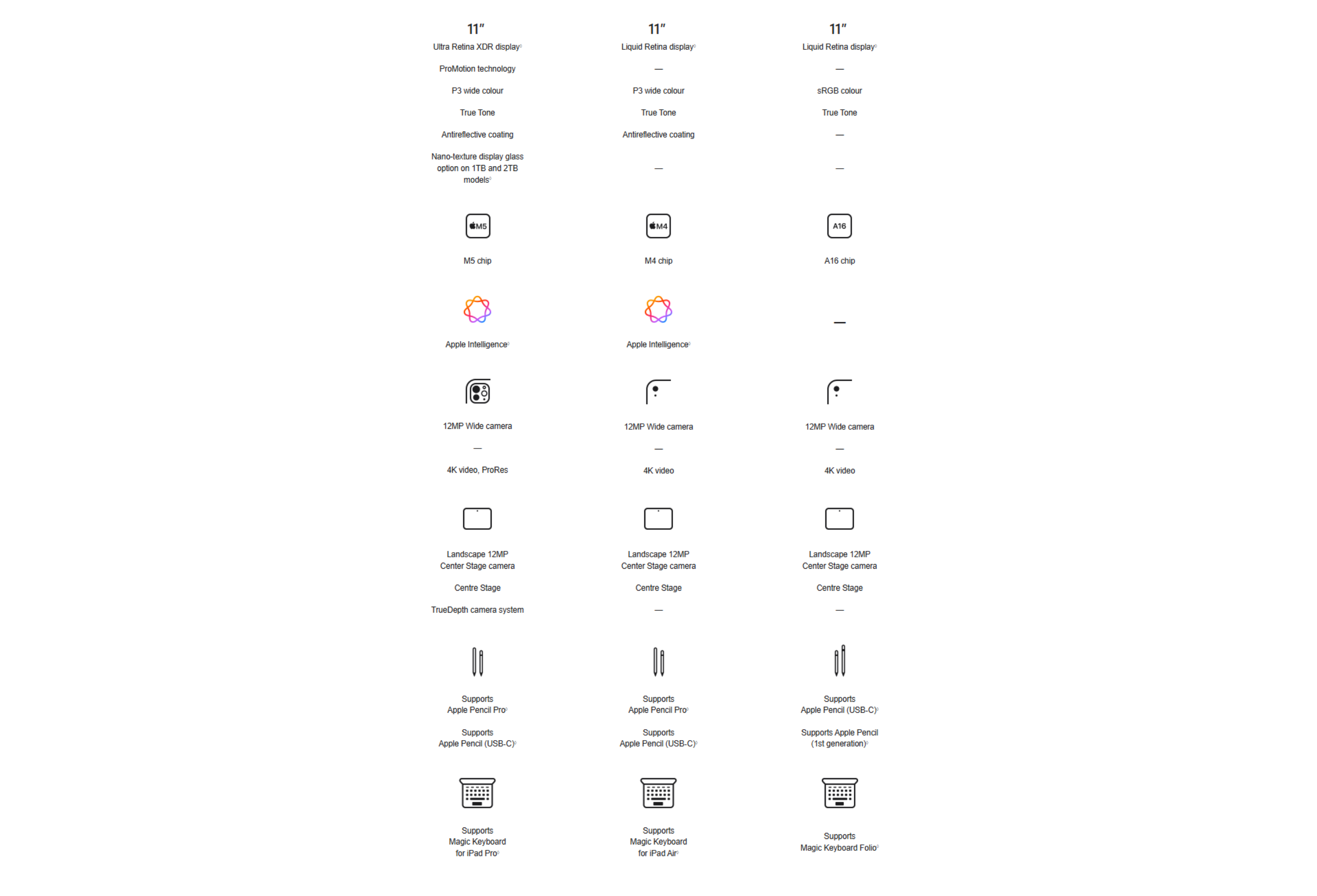 • Display: The displays have rounded corners. When measured diagonally as a rectangle, the 13-inch iPad Pro is 13 inches, the 11‑inch iPad Pro is 11.1 inches, the 13‑inch iPad Air is 12.9 inches, the 11‑inch iPad Air and iPad (A16) are 10.86 inches, and the iPad mini is 8.3 inches. Actual viewable area is less.