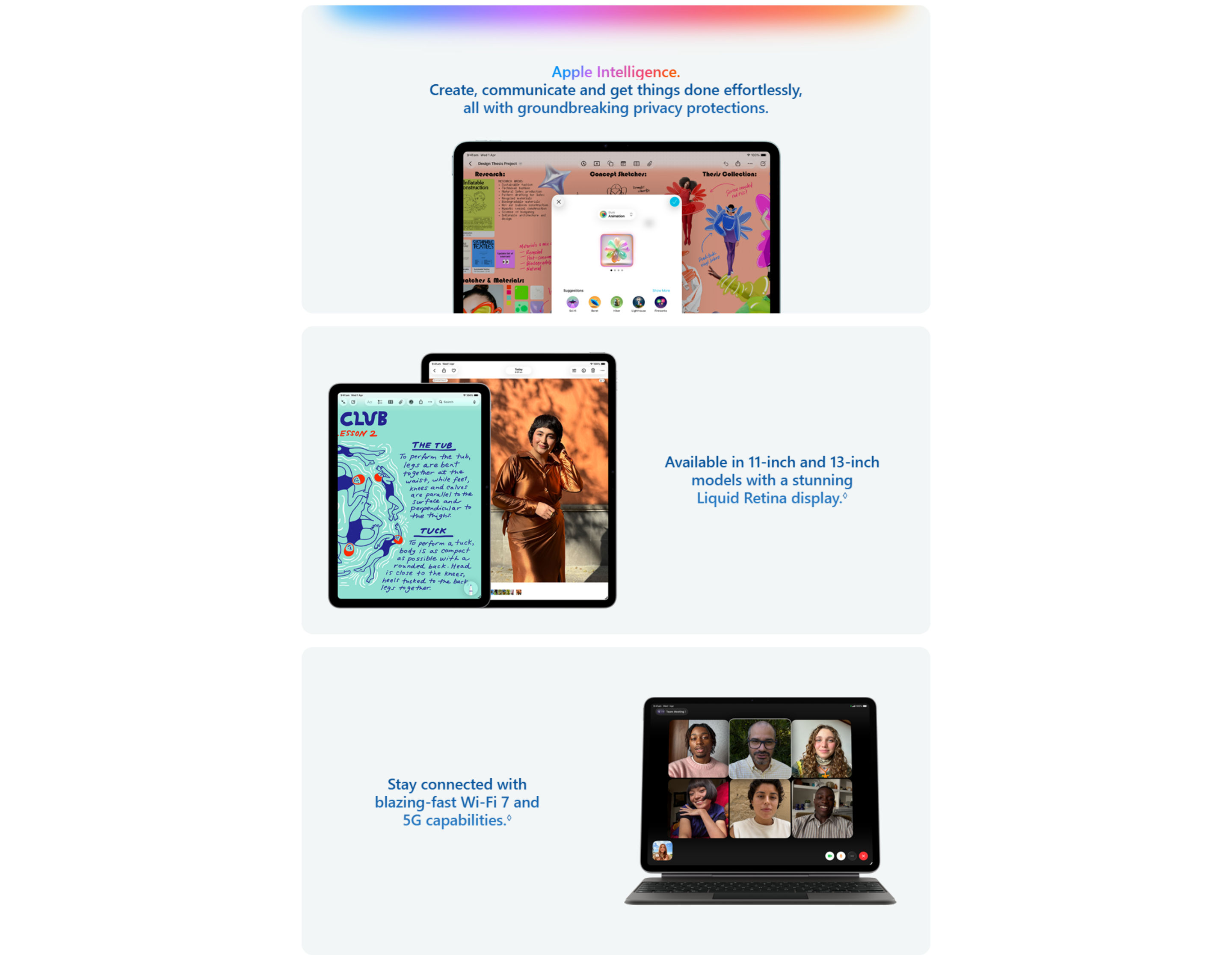 • 5G: Data plan required. 5G is available in selected markets and through selected carriers. Speeds vary based on site conditions and carrier. For details on 5G support, contact your carrier and see apple.com/au/ipad/cellular.