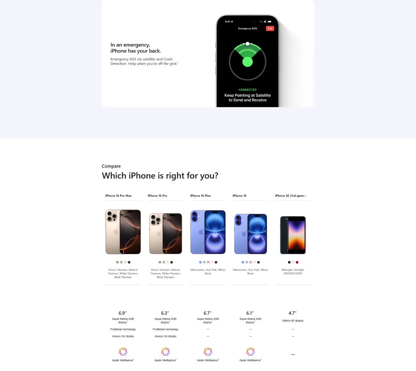 Crash Detection: iPhone 16 models can detect a severe car crash and call for help. Requires a mobile network connection or Wi‑Fi calling.