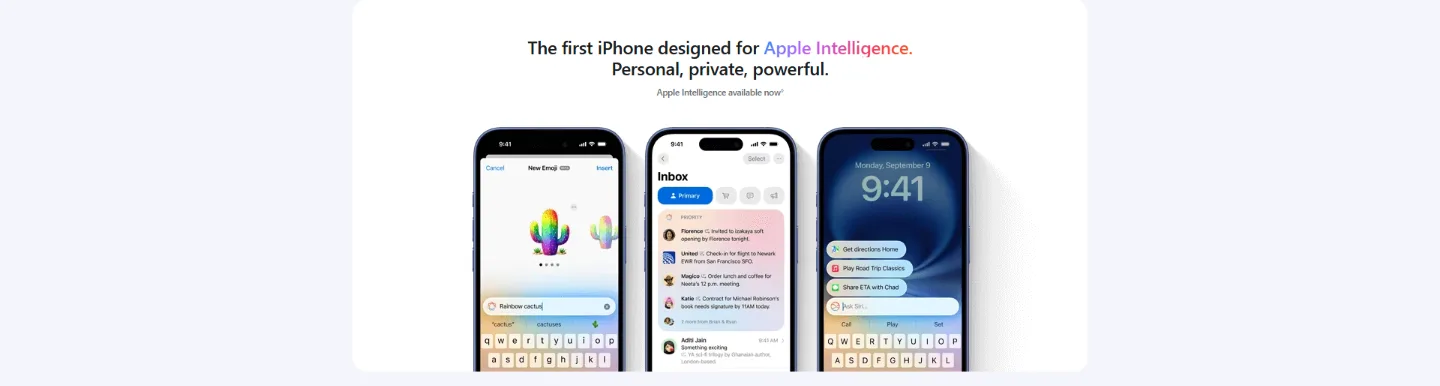 Apple Intelligence: Apple Intelligence is available in beta on all iPhone 16 models, iPhone 15 Pro and iPhone 15 Pro Max, with Siri and device language set to Chinese (Simplified), English (Australia, Canada, India, Ireland, New Zealand, Singapore, South Africa, UK or US), French, German, Italian, Japanese, Korean, Portuguese (Brazil) or Spanish, as an iOS 18 update, with more languages coming over the course of the year, including Vietnamese. Some features may not be available in all regions or languages.