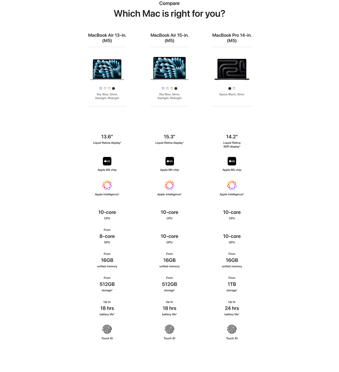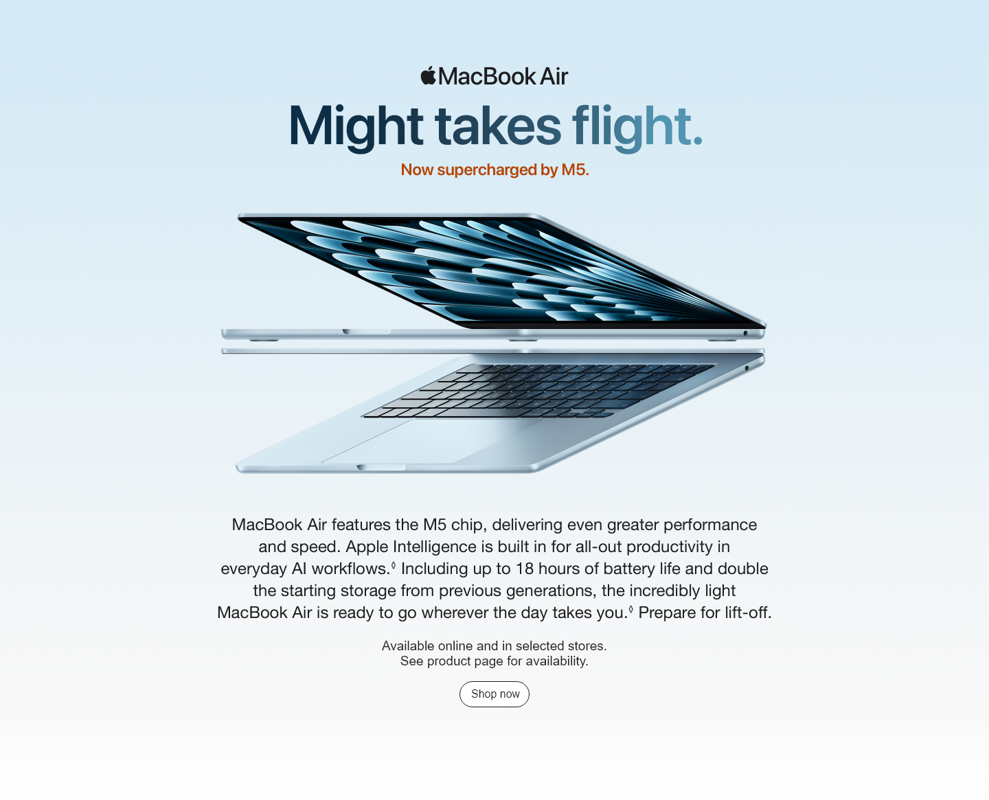 Up to 9.5x Faster than MacBook Air with M1: Testing conducted by Apple in January 2026 using preproduction 13-inch and 15-inch MacBook Air systems with Apple M5, 10-core CPU, 10-core GPU, 32GB of unified memory and 4TB SSD; and production MacBook Air systems with Apple M1, 8-core CPU, 8-core GPU, 16GB of unified memory and 2TB SSD. Time to first token measured with an 8K-token prompt using a 14-billion parameter model with 4-bit quantisation and LM Studio 0.4.1 (Build 1). Performance tests are conducted using specific computer systems and reflect the approximate performance of MacBook Air.