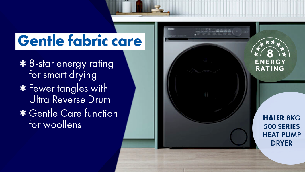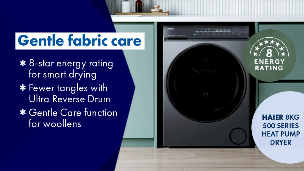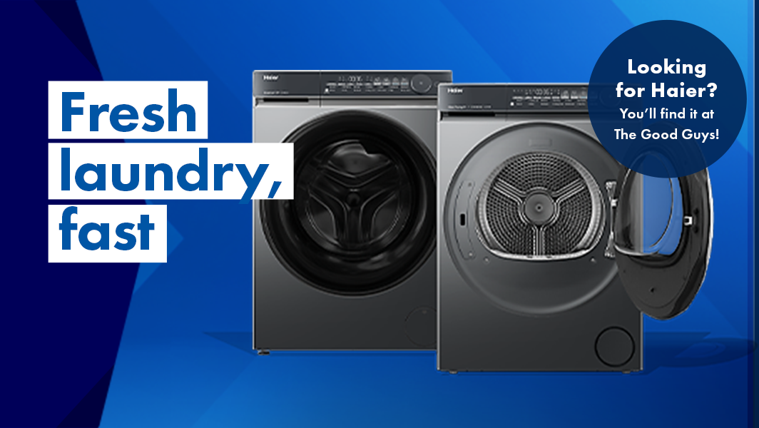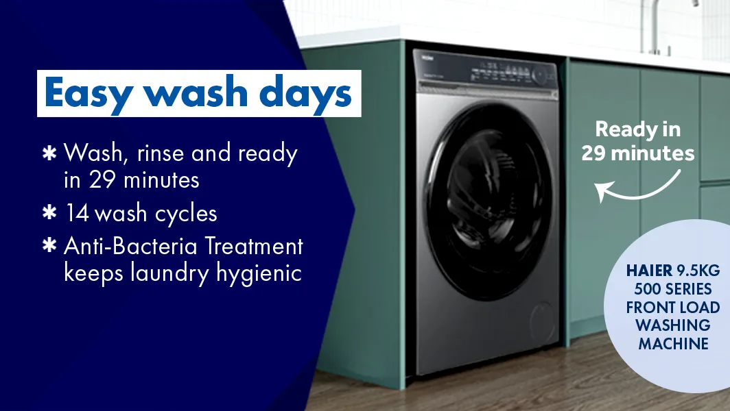 June 6•4 mins readNo time to iron? Too busy to whip your wet clothes out of the washing machine and into the clothes dryer? Wish some smart tech could carry the mental load of choosing the perfect washing cycle… and remove that oil stain from your favourite shirt? Good news – Haier got the memo and has released a washing machine and dryer duo with all the answers. And the best bit? When they’re paired together, they not only make washdays so much easier, they’ll also give any laundry space an instant style makeover – no reno required! Introducing the Haier 500 Series 12kg Front Load Washer and Haier 500 Series 10kg Heat Pump Dryer: a power couple that works harder to take better care of your fabrics, your family – and itself! Read on as we reveal how Haier’s innovative tech and design- forward style can get you off the dirty-clothes treadmill faster while effortlessly “looksmaxxing” your laundry.