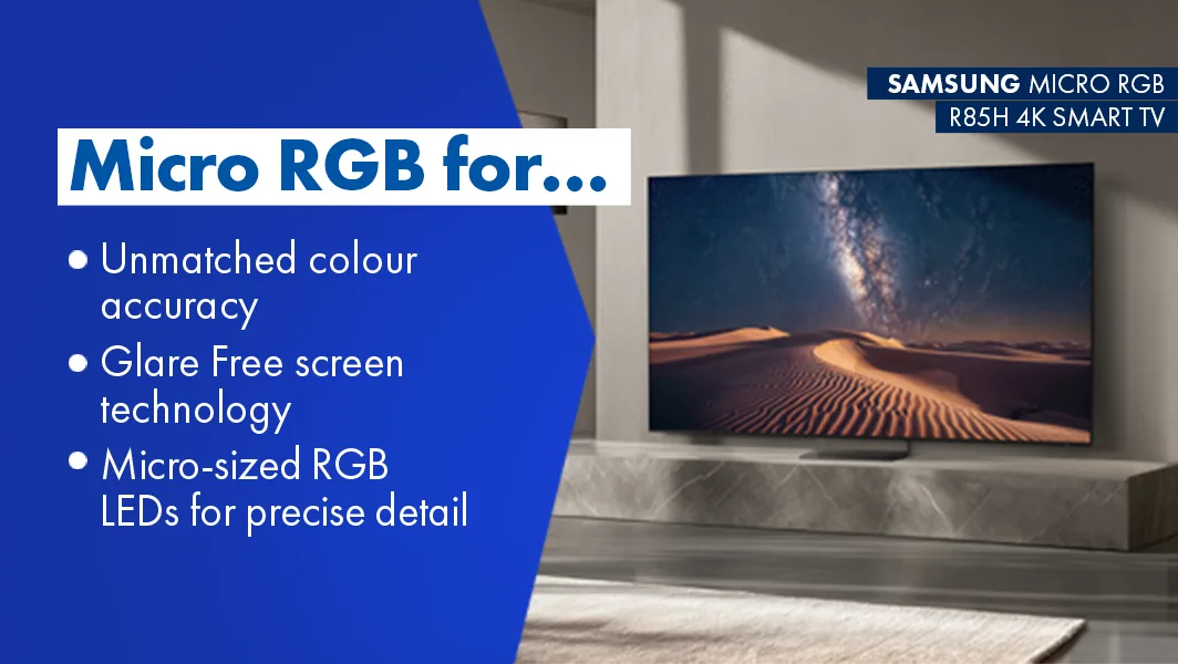 Meet the Samsung Micro RGB range, the answer to greatness! Utilising Micro RGB Technology, which is Microsized RGB LED lights, providing hyper-realistic colour proving sometimes smaller is better!