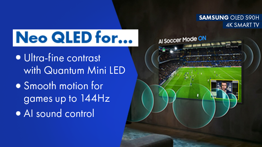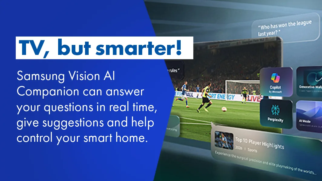 Getting help from Samsung Vison AI Companion has never been easier —whether it’s recommending what to wear based on trending clothing styles, or finding the perfect brunch spot nearby. Responses come instantly with related video/image options to choose from, making your discovery richer and more personalised than any other AI assistant on your TV. Plus, with incredible Vision AI features you can tailor your viewing even more, like with AI Soccer Mode. Turn on AI-driven picture and sound tuning made for soccer. Enhance player detail with clear commentary to help you follow every pass and every moment with stadium-like intensity. With smart scene-by-scene optimisation, your TV automatically helps deliver a sharp, immersive match-day experience, so you can stay locked into the game from kick-off to final whistle4.
