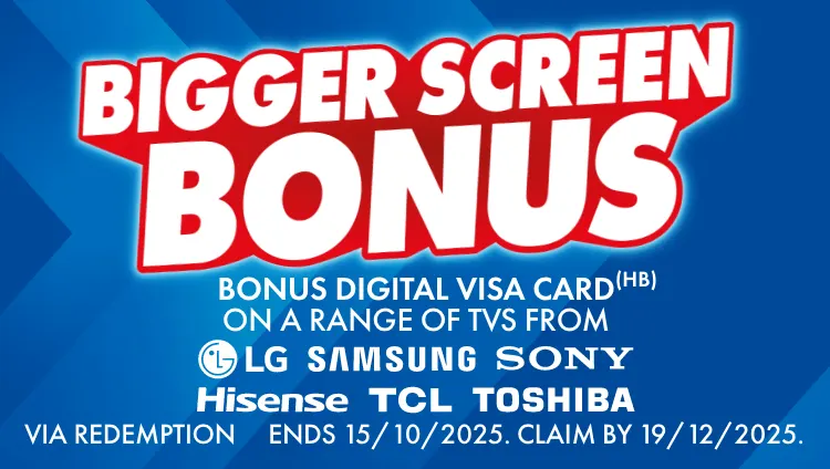 (HB) Offer starts 12:01am AEST 02/10/2025 and ends 11:59pm AEDT 15/10/2025. Offer available in store, online and by phone. Must be redeemed by lodging a claim here by 19/12/2025. Issued to customer by email within 7 business days. Full payment must be made by promotion close date. Limit of one Bonus issued per eligible model purchased. The digital Visa Gift Card is subject to T&Cs available here. Excludes eBay and commercial orders. Not available in conjunction with any other offer. T&Cs apply. For full details visit here. Shop all eligible models below.