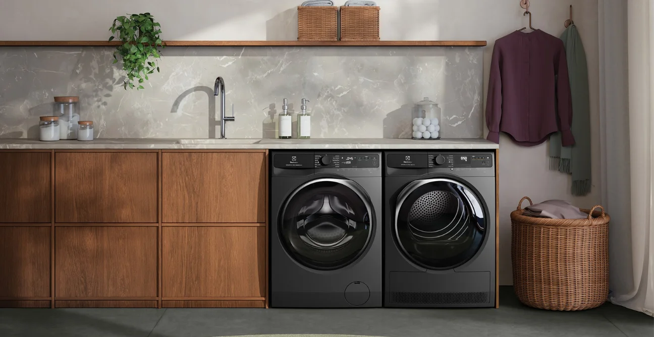 Electrolux matching washer and dryer in a modern laundry with wooden cabinetry
