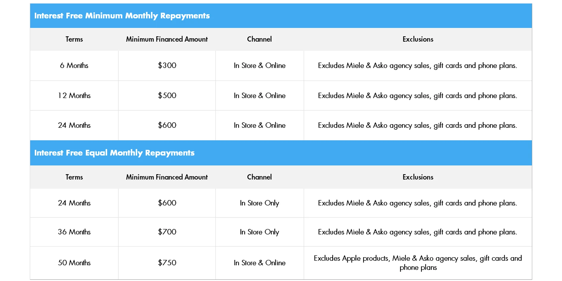 Minimum Monthly Plans give you access to Interest Free for the plan term, provided you pay your credit card minimum payment each month.