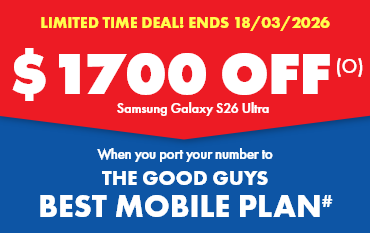 (O)Offer only available for eligible port-in mobile services (being an existing mobile service transferred from another provider excluding any service that has been active on a Telstra, JB Hi-Fi, The Good Guys or Boost plan at any time in the 30 days before the transfer). Offer applies to current pre-order price of device. As prices change regularly and we frequently run sales and negotiate on price, prices may change after offer ends. The $1700 off the current ticketed price of a Samsung S26 Ultra (SM-S948BLBAATS, SM-S948BLBEATS, SM-S948BZKAATS, SM-S948BZKEATS, SM-S948BZVAATS, SM-S948BZVEATS, SM-S948BZWAATS, SM-S948BZWEATS) (referred to as “The Good Guys Voucher” in the Telstra Terms and Conditions) replaces the dollar value of the Voucher in the Critical Information Summary and will be applied instore after connection approval by Telstra. If you cancel or move to a lower cost/different plan then you must pay a Voucher Repayment Fee to Telstra pro-rated against the remaining months of your plan’s minimum term. This offer is not available in conjunction with any other The Good Guys Mobile or Broadband offer, trade-in coupon offer or other coupon. Limit of 3 offers per customer, and only one offer can be applied per device.