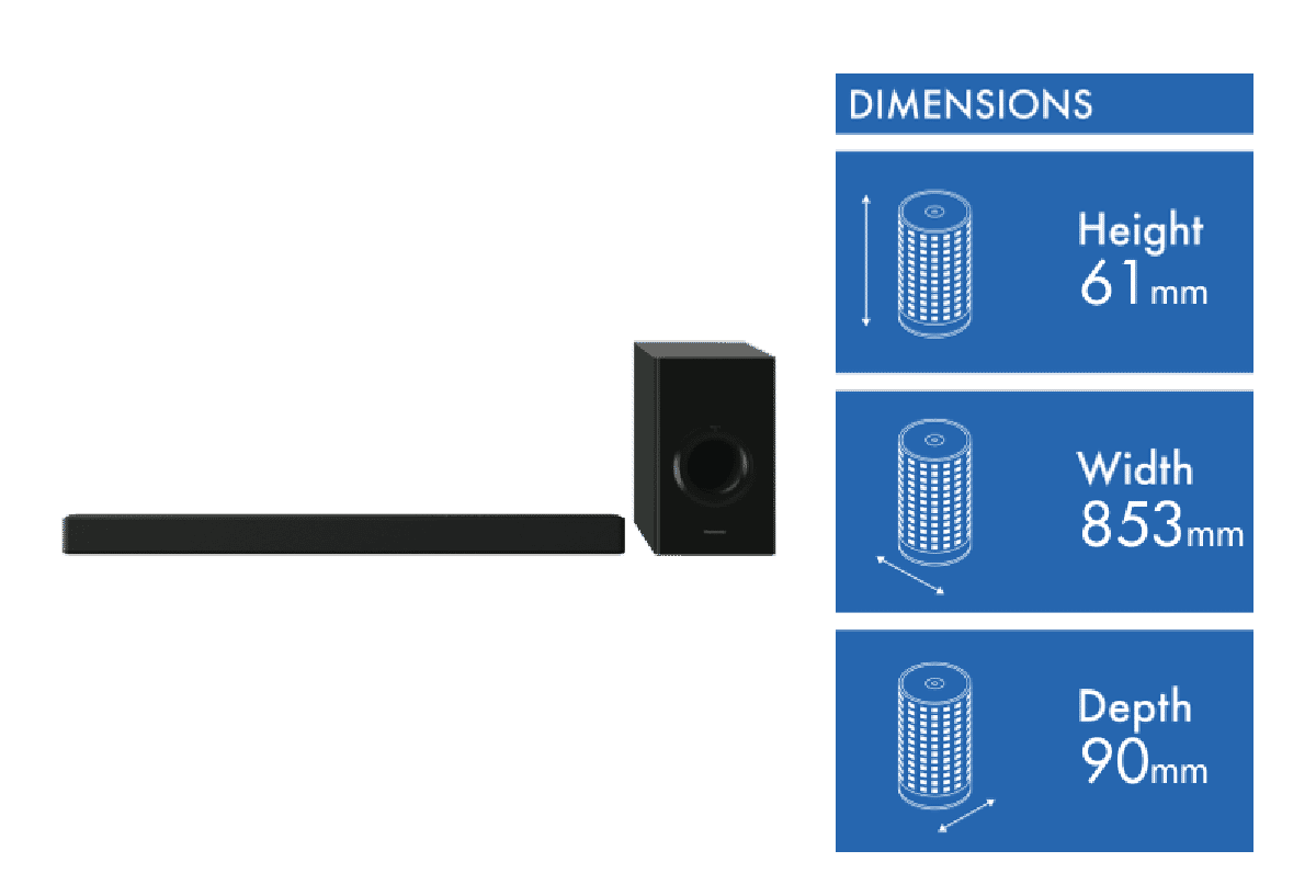 Whilst 5.1ch and 7.1ch Soundbars can produce sounds that come from left, right, front and behind, Dolby Atmos and DTS-X compatible Soundbars add overhead sounds using additional upward directed speakers to bounce sound off the ceiling for a 3D audio effect.
