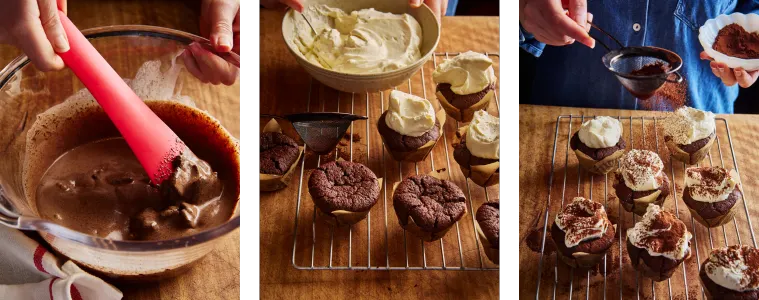 Serve warm as they are OR, if you’d like, wait until the puddings are cool, then whip the cream and creme fraiche to just semi-firm peaks and spoon the billowy peaks over the cakes. Dust liberally with cocoa.