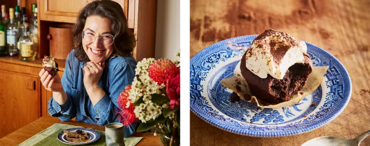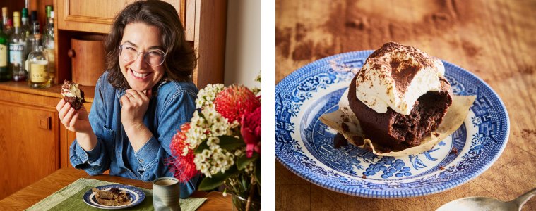 These are my kind of melt-n-mix mini puddings that are easiest of all to make, perfect for sharing, and they’re gluten-free! Baking cakes and puddings is always best done in a conventional oven, which is why most fan ovens provide a “conventional” setting. That way, the batter doesn’t rise too quickly and crack on you. Luckily, even if this happens, once they’re cooled, you can mask any funny business with a decadent dollop of fluffy-cloud cream and crème fraiche, which you can whisk by hand, or set and forget in your stand mixer. Think of the flavour profile as an Irish coffee, in solid form. The espresso and whiskey balances brilliantly with the broody sweetness of couverture chocolate and cocoa. ‘Couverture’ refers to the quality of the chocolate, with a greater percentage of cocoa butter and finer texture, which gives it that rich, melt-in-the-mouth result we crave in chocolate desserts. Indeed, with the surprising pops of salted chocolate already gilding this lily, you’re welcome to leave the whiskey (and even the coffee) out entirely if making these with the kiddies, swapping in 50ml of just-boiled water instead.